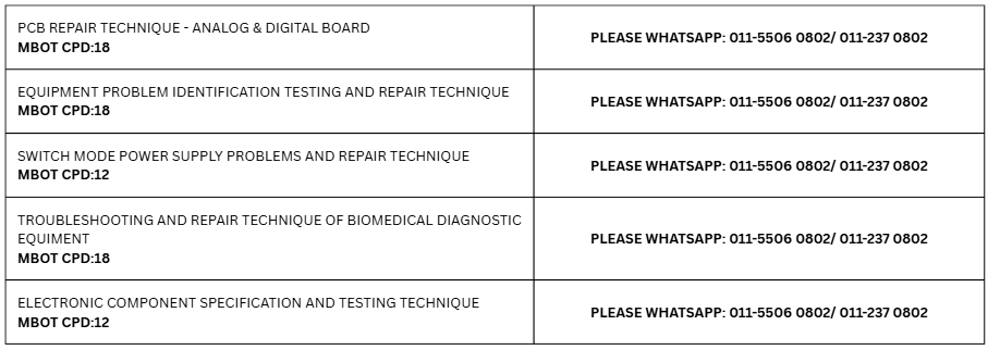 Ensuring compliance with electrical safety standards, accurate calibration, and effective troubleshooting of medical devices is essential for the safe operation of medical electrical equipment. Our specialized training programs provide biomedical professionals with the critical skills to perform accurate safety tests, interpret results, calibrate devices, and troubleshoot equipment issues. By participating in these courses, you will enhance your expertise and contribute to a safer healthcare environment.