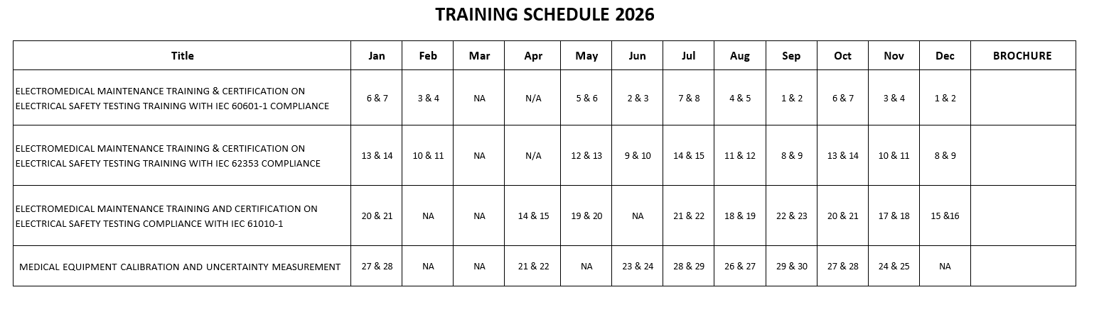 Ensuring compliance with electrical safety standards, accurate calibration, and effective troubleshooting of medical devices is essential for the safe operation of medical electrical equipment. Our specialized training programs provide biomedical professionals with the critical skills to perform accurate safety tests, interpret results, calibrate devices, and troubleshoot equipment issues. By participating in these courses, you will enhance your expertise and contribute to a safer healthcare environment.